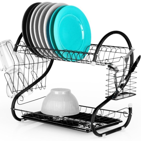 Kompaktowa, dwupoziomowa suszarka do naczyń w kolorze czarnym. Posiada miejsce na talerze, szklanki, kubki, ociekacz na sztućce oraz uchwyt na deskę do krojenia. Wyposażona w tacę ociekową.