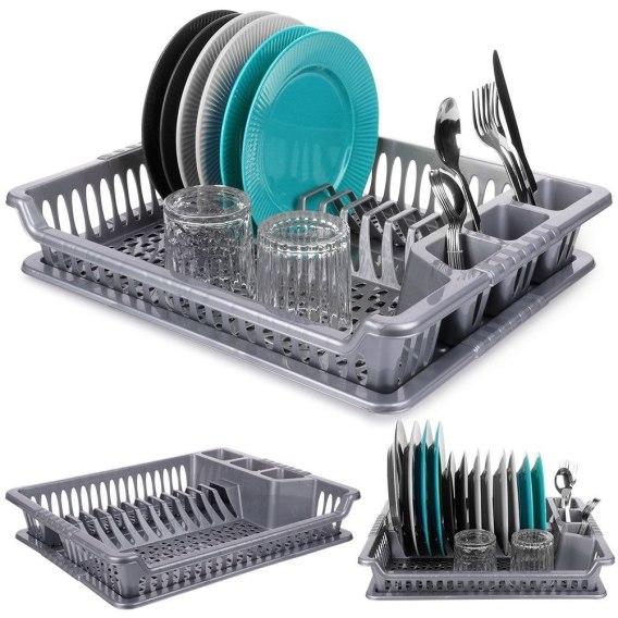 Suszarka do naczyń w kolorze szarym. Posiada miejsce na talerze, sztućce, miseczki, szklanki oraz kubki. Wyjmowana taca zapewni łatwe czyszczenie.