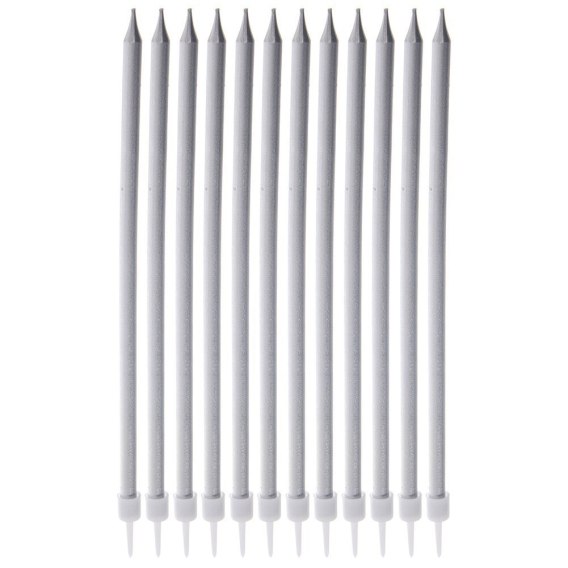 Zestaw 12 długich świeczek do tortu wraz z podstawkami, które zapewnią im stabilność. Świeczki mają długość 14,5 cm i są w kolorze srebrnym.