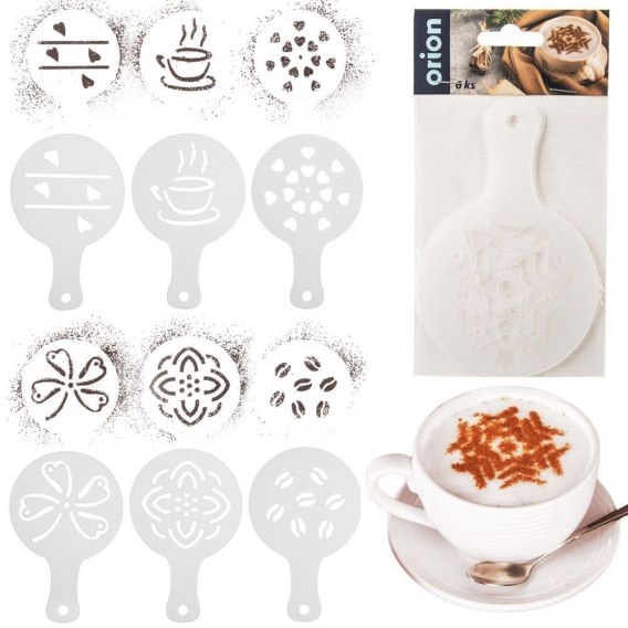 Zestaw sześciu szablonów do kawy i deserów. Wykonane z wytrzymałych materiałów, wygodne w użytkowaniu i łatwe w czyszczeniu. Z ich pomocą możemy stworzyć efektowne dekoracje na napojach i deserach. Idealne do ozdabiania kawy cappuccino czy latte, ciasteczek, tortów, ciast oraz innych słodkich wypieków. W celu odpowiedniej konserwacji nie zaleca się mycia w zmywarce do naczyń. Oryginalny produkt czeskiej marki Orion. Wyprodukowano zgodnie z europejskimi standardami.