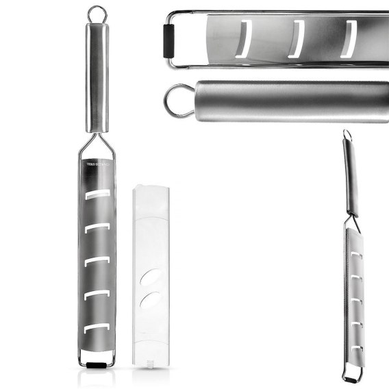 WYGODNA - Tarka posiada długi uchwyt, który zapewni wygodne użytkowanie. Dodatkowo posiada otwór, który umożliwi zawieszenie tarki np. na relingu kuchennym. W zestawie etui ochronne. Dzięki niemu inne przybory kuchenne w szufladzie się nie porysują.