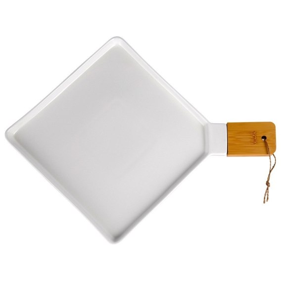 Talerz z uchwytem do serwowania różnych dań i przekąsek. Wykonany z białej porcelany i drewna bambusowego. Prezentuje się niezwykle elegancko i nowocześnie.