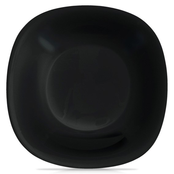 Kwadratowy talerz obiadowy głęboki wykonany ze szkła opalowego w czarnym kolorze. Idealny do serwowania zup, makaronów czy sałatek. Nadaje się do zmywarki i mikrofalówki.