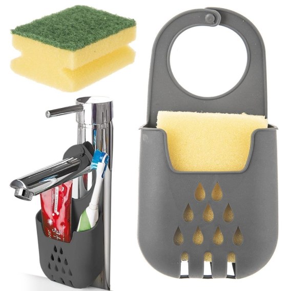 Uchwyt na gąbkę do mycia naczyń wraz z gąbką. Wykonany z tworzywa w szarym kolorze. Pozwoli utrzymać porządek w kuchni. Mocowany za pomocą przyssawki.