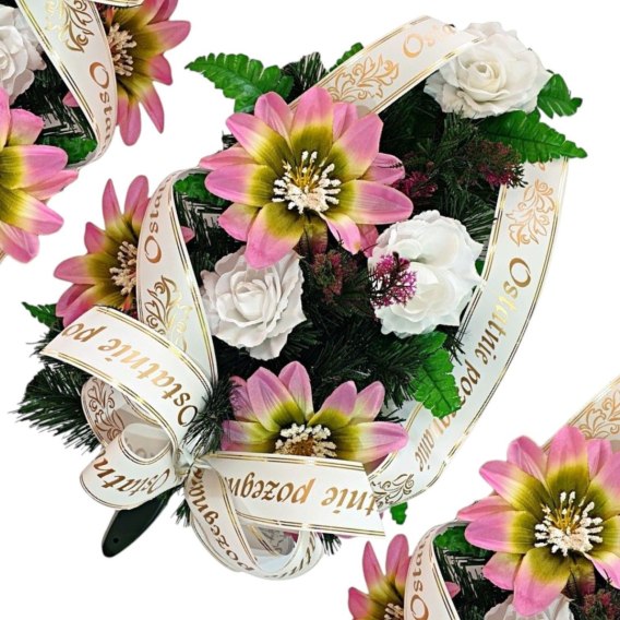 Wiązankę cechuje gęsty splot sztucznych gałązek iglastych, które tworzą estetycznie wyglądające tło dla unikalnej kompozycji kwiatów. Starannie dobrane kwiaty są niezwykle realistyczne i naturalne, dodając wiązance autentyczności i podkreślając jej uroczysty charakter.