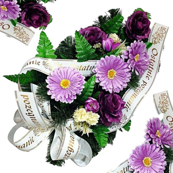 Kwiaty są integralnym elementem ceremonii ostatniego pożegnania lub jako element ozdobienia grobu, łącząc szacunek i elegancję w jednym, starannie wykonanym projekcie. Podkład wieńca jest wykonany z zielonych, gęsto splecionych gałązek PCV, które są zarówno trwałe, jak i estetyczne, podkreślając kolorystykę wiązanki.