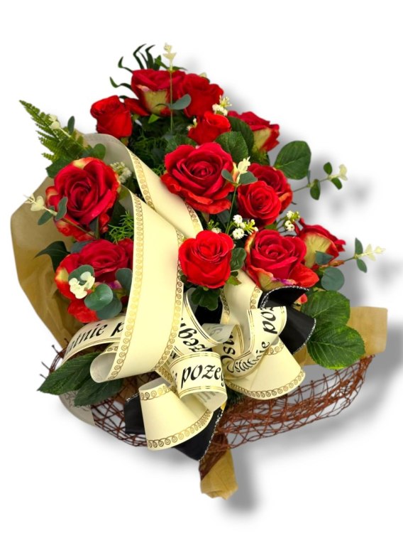 Wiązankę cechuje gęsty splot sztucznych gałązek iglastych, które tworzą estetycznie wyglądające tło dla unikalnej kompozycji sztucznych kwiatów. Starannie dobrane kwiaty są niezwykle realistyczne i naturalne, dodając wiązance autentyczności i podkreślając jej uroczysty charakter.