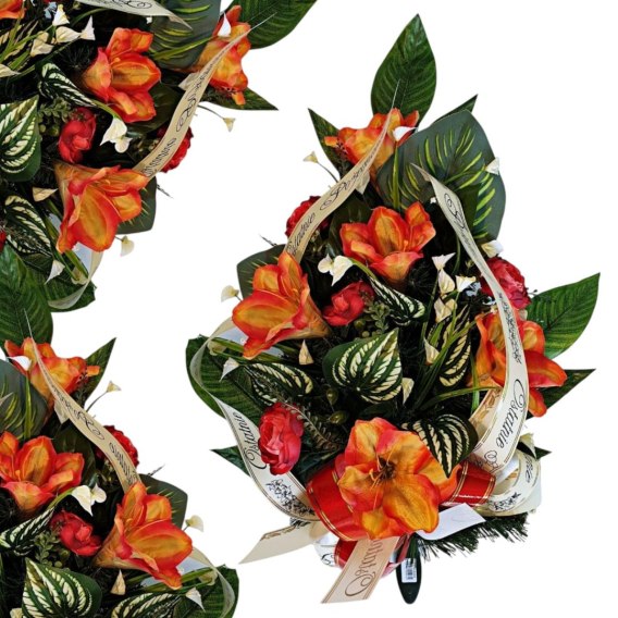 Nasz wieniec pogrzebowy cechuje się wyjątkowo gęstym splotem sztucznych gałązek iglastych, które tworzą estetycznie wyglądające tło dla unikalnej kompozycji kwiatów. Starannie dobrane kwiaty są niezwykle realistyczne i naturalne, dodając wiązance autentyczności i podkreślając jej uroczysty charakter.