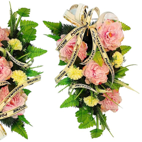 Nasz wieniec pogrzebowy cechuje się wyjątkowo gęstym splotem sztucznych gałązek iglastych, które tworzą estetycznie wyglądające tło dla unikalnej kompozycji kwiatów. Starannie dobrane kwiaty są niezwykle realistyczne i naturalne, dodając wiązance autentyczności i podkreślając jej uroczysty charakter.