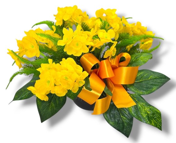 Kompozycje nagrobne z wysokiej jakości sztucznych kwiatów i roślin.