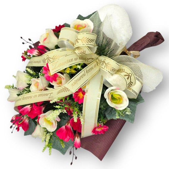Wiązankę cechuje gęsty splot sztucznych gałązek iglastych, które tworzą estetycznie wyglądające tło dla unikalnej kompozycji sztucznych kwiatów. Starannie dobrane kwiaty są niezwykle realistyczne i naturalne, dodając wiązance autentyczności i podkreślając jej uroczysty charakter.