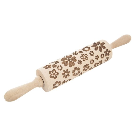 Obrotowy wałek do dekoracji ciasta oraz masy cukrowej. Posiada dekor w postaci kwiatów. Wykonany z naturalnego drewna bukowego.