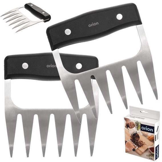 Zestaw dwóch widelców do chwytania i szarpania różnych rodzajów mięsa. Szarpane mięso możemy podać w kanapkach, bagietkach, burgerach. Z ich pomocą przygotujemy wygodnie popularny pulled pork. Korzystanie z widelców jest wyjątkowo łatwe. Doskonale sprawdzą się podczas grillowania, pieczenia oraz gotowania. Wykonane z solidnych materiałów, odpowiednio użytkowane posłużą długie lata. Oryginalny produkt czeskiej marki Orion. Wyprodukowano zgodnie z europejskimi standardami.