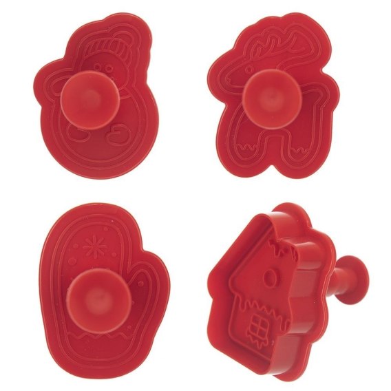 PRAKTYCZNE - Zestaw czterech wykrawaczy cukierniczych wraz z tłokiem w kształcie: renifera, rękawicy, domku oraz bałwana. Idealne do przygotowania ciasteczek i pierników na Boże Narodzenie.