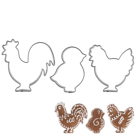Zestaw trzech wykrawaczy w kształcie: koguta, pisklaka oraz kury. Wykonane ze stali nierdzewnej. Idealne do wykrawania ciasteczek i pierników.
