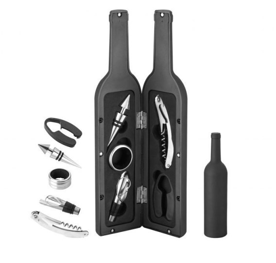 Zestaw akcesoriów do wina w kształcie butelki, bardzo dobrze komponuje się w barku z pozostałymi butelkami.