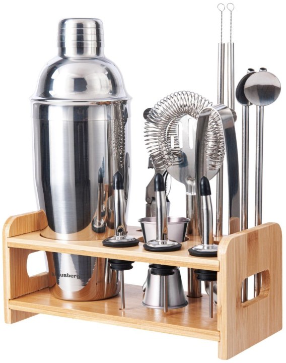 15-częściowy zestaw barmański firmy KLAUSBERG Atrakcyjny i wygodny sposób przechowywania i prezentowania narzędzi barowych umieszczonych w stojaku, starannie zaprojektowany, aby narzędzia barowe były uporządkowane i dostępne przez cały czas. Nigdy więcej nie doświadczysz bałaganu w szufladach i szafkach kuchennych. Pochwal się swoim wspaniałym zestawem cocktailowym z unikalnym stojakiem do przechowywania. Może to być idealny pomysł na prezent. Na pewno zdobędziesz uwagę swoich gości. Solidny, trwały, ciężki wysokiej jakości zestaw akcesoriów barowych do robienia koktajli, wykonany ze stali nierdzewnej. Łatwe do czyszczenia ręcznego: Po użyciu każdego z elementów zestawu shakerów wystarczy spłukać go ciepłą wodą, wymyć delikatnym detergentem przy użyciu miękkiej gąbki, wypłukać i wytrzeć do sucha. Przestrzegając te zasady shaker koktajlowy przez wiele lat będzie wyglądał jak nowy. W zestawie: