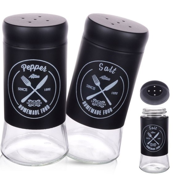 • SOLIDNE - Wykonane z wysokiej jakości szkła oraz metalu w modnym, czarnym kolorze. Białe nadruki precyzyjnie określają przeznaczenie, ułatwiając odróżnienie soli od pieprzu.