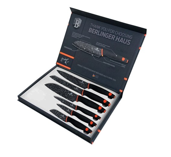 6 częściowy zestaw noży BERLINGER HAUS z serii GRANIT DIAMOND pokrytych nieprzywierającą powłoką granitową w kolorze czarnym. Noże wyprodukowane w wysokiej temperaturze, w zaawansowanym technologicznie procesie syntezy - ostrza cechuje długa żywotność bez konieczności ostrzenia. Wyposażone w ergonomiczne, antypoślizgowe uchwyty - wygodne i pewne trzymanie. Materiał: stal nierdzewna pokryta powłoką granitową - nie pozostawiają na żywności nieprzyjemnego, metalicznego posmaku. Bardzo ostra laserowo ostrzona,nie tępiąca się powierzchnia. Brak plam po produktach spożywczych. Powierzchnia antybakteryjna. Nie rdzewieją. Nie pozostawiają smaku metalu na krojonej żywności. Zalecane używanie noży na drewnianych i plastikowych deskach do krojenia. Zapakowane w gustowne pudełko z zamknięciem magnetycznym.