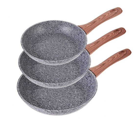 Wykonane z wysokiej jakości odlewanego aluminium. Potrójna granitowa powłoka anty-przywierająca. Uchwyty powlekane silikonem typu SOFT TOUCH o wyglądzie do złudzenia przypominającym drewno. Można myć w zmywarce. Przystosowane do wszystkich rodzajów kuchenek: gazowa, elektryczna, ceramiczna, halogenowa, indykcyjna System TURBO INDUCTION (bardzo szybko nagrzewają się)35% oszczędność energii.