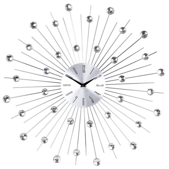 Niezwykle elegancki i stylowy zegar ścienny. Na promieniach znajdują się różnej wielkości kryształki nadające niezwykłego efektu. Doskonała ozdoba mieszkania, biura, sklepu lub restauracji.
