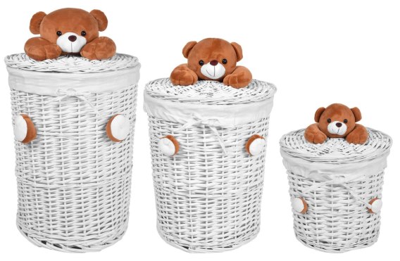 Praktyczne i pobudzające wyobraźnię koszyki wiklinowe z motywem misia to niezbędnik w pokoju każdego dziecka. Cenisz sobie porządek i estetyczny wygląd? Biały kolor wikliny znakomicie wpisze się w kolorowy pokój, niezależnie od preferowanego stylu wnętrza. Różnorakie rozmiary pozwolą przechować zarówno większe zabawki, jak i drobne figurki i samochodziki. W ten sposób znacznie łatwiej pracować z dziećmi nad utrzymaniem porządku. Znakomicie sprawdzają się też w różnych zabawach. Wnętrze każdego z koszyków wyścielone jest lnianym materiałem. Na pokrywie każdego kosza znajduje się miś-porządniś. Doskonałe uzupełnienie dziecięcego pokoju!