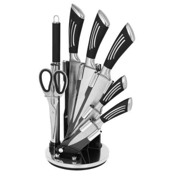 W komplecie znajduje się także ostrzałka, która pozwoli w prosty sposób utrzymać perfekcyjną ostrość noży, oraz wielofunkcyjne nożyczki, przydatne zarówno do kuchennych, jak i codziennych prac. Całość dopełnia obrotowy stojak, który nie tylko porządkuje przestrzeń roboczą, ale też efektownie prezentuje się na blacie kuchennym.