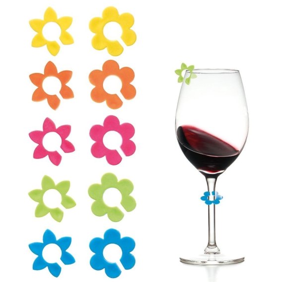 PRZYDATNE - Zestaw 10 sztuk kolorowych znaczników na szklanki. Znaczniki są w kształcie kwiatków są dostępne w dwóch rozmiarach o średnicy 2,5 cm i 2 cm. Świetny sposób na oznaczenie szklanek i kieliszków.